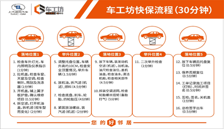 从工作人员快速接车开始,共计16个细致的检修保养项目,每个项目时间精准到0.5分钟到5分钟之间,工序紧凑,分秒必争,为客户提供全车检查,更换机油及机油滤清器、空滤拆装、服务记录签单等的全套服务。30分钟快保,准时签字出车。